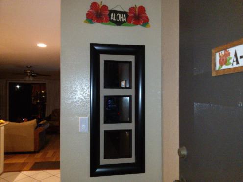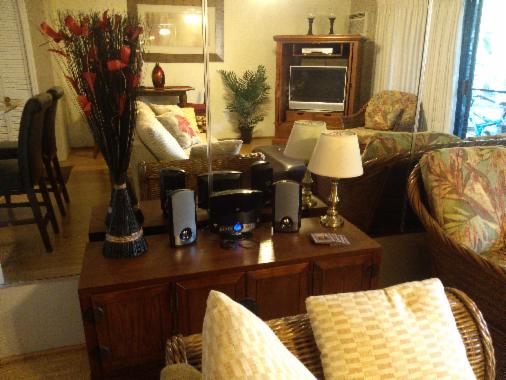 Music player with CD and MP3 aux. Beautiful storage cabinet. Additional clothing storage in white cabinets. Mirrored living room. All new decorative vases and floral arrangements.