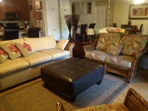 From the living room looking toward the kitchen, new ottoman and new queen sleeper sofa with very comfortable memory foam mattress topper. Clothing storage in white cabinets.