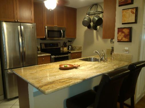 Kitchen with new granite counter tops, new stainless appliances, new leather barstools, all other small appliances, glassware, dishware
