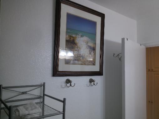 Plenty of hooks for towels, bathing suits, etc. and towel storage rack