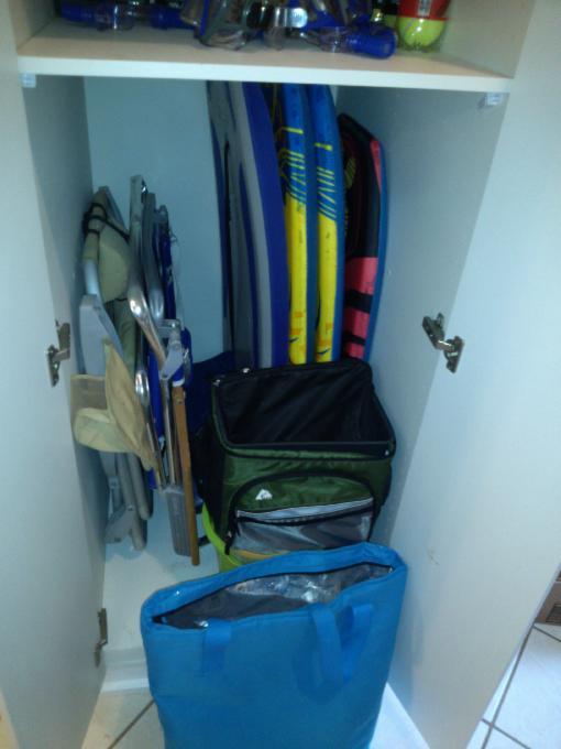 Beach gear: beach chairs, boogie boards, snorkel masks, fins, tennis racquets, tennis balls, binoculars, frisbee, bike tools and pump, paddleball